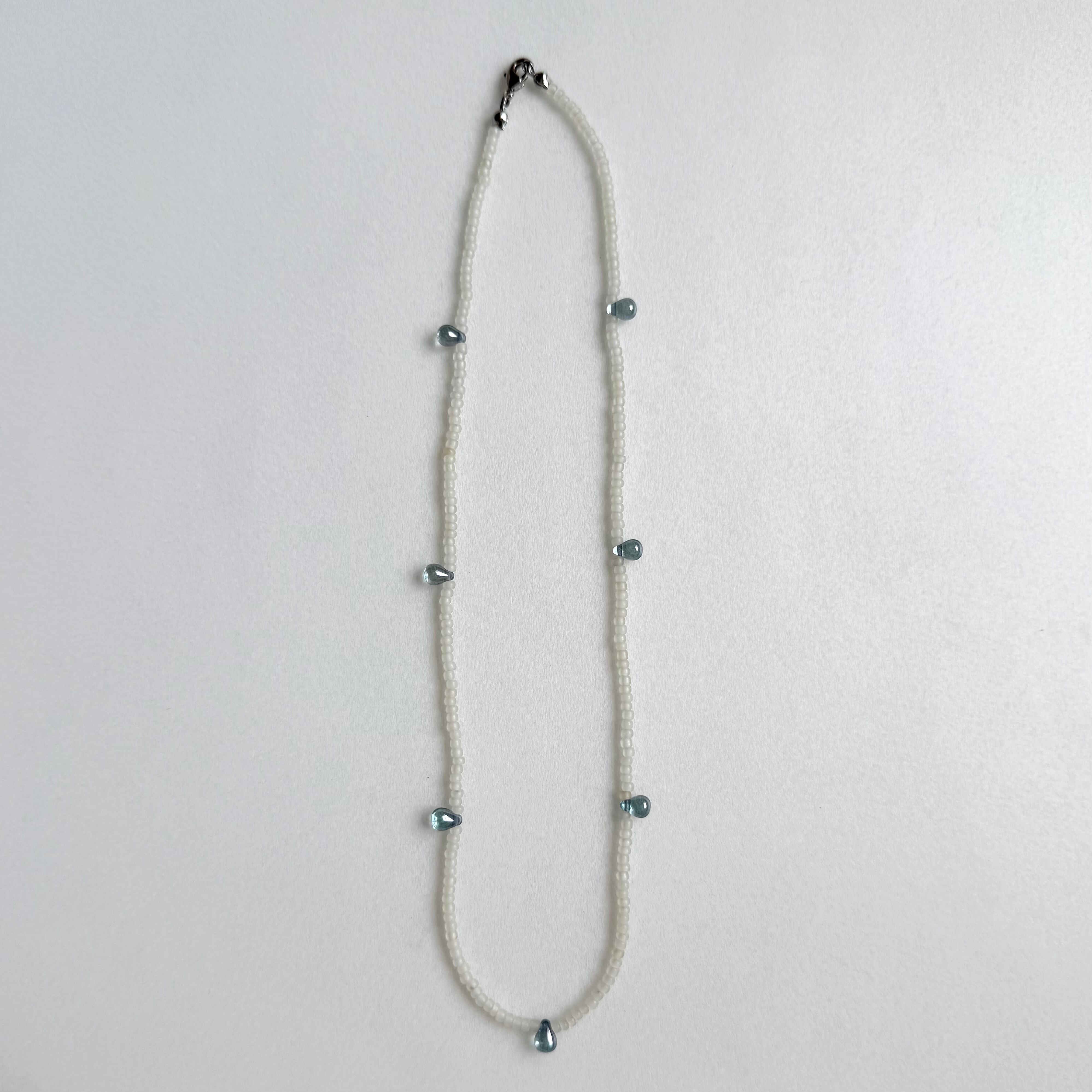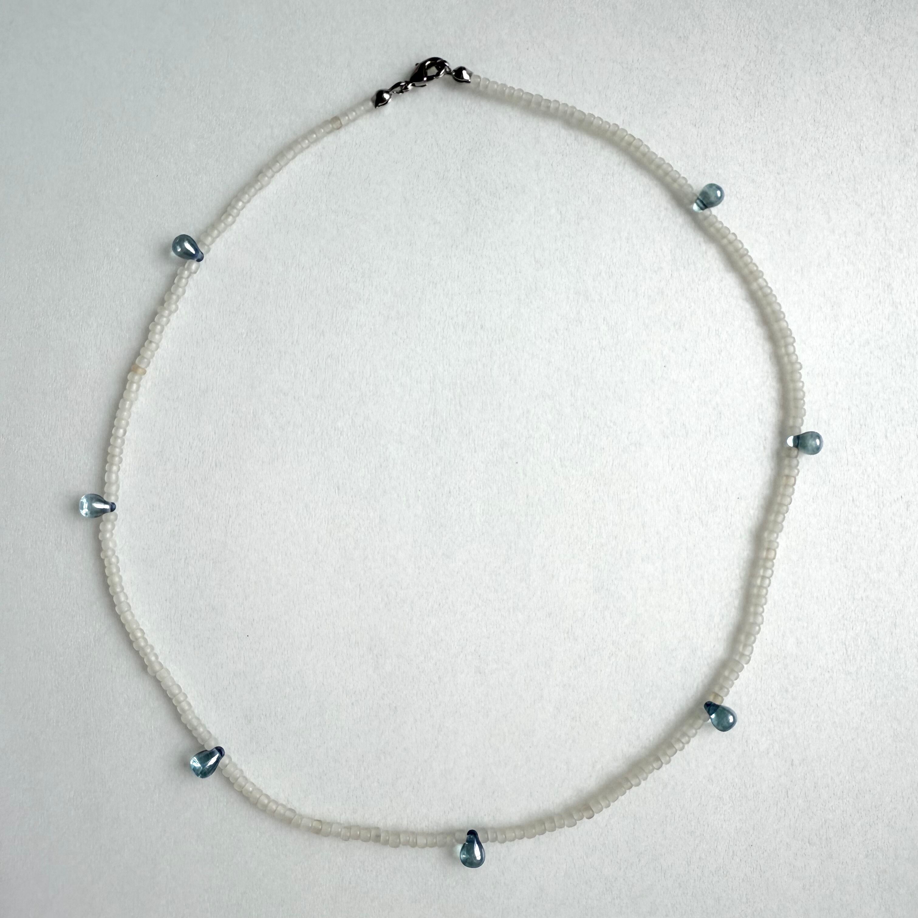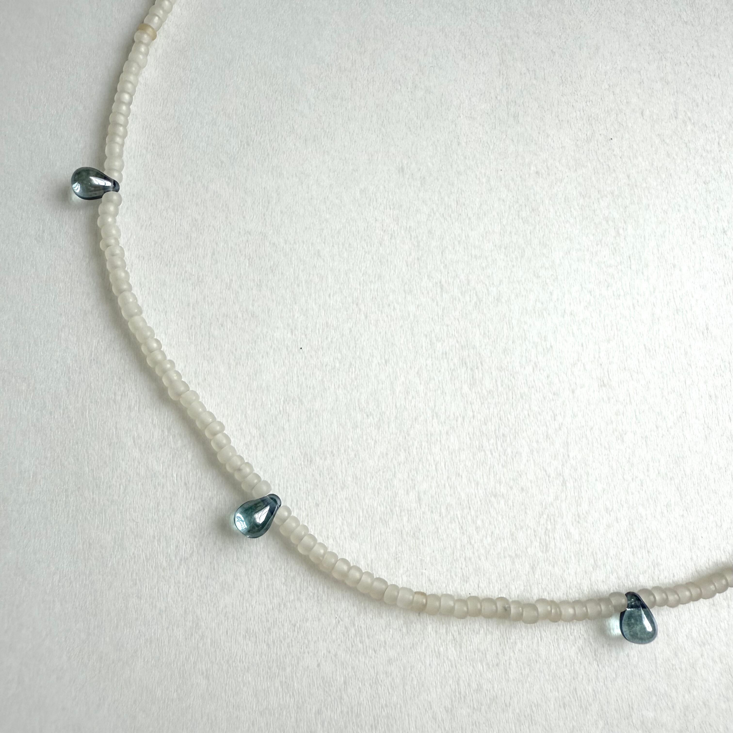 マットのホワイトビーズにクリアブルーグレーのチェコのガラスパーツがポイントになり、品よくきらっと光るアイテムです。