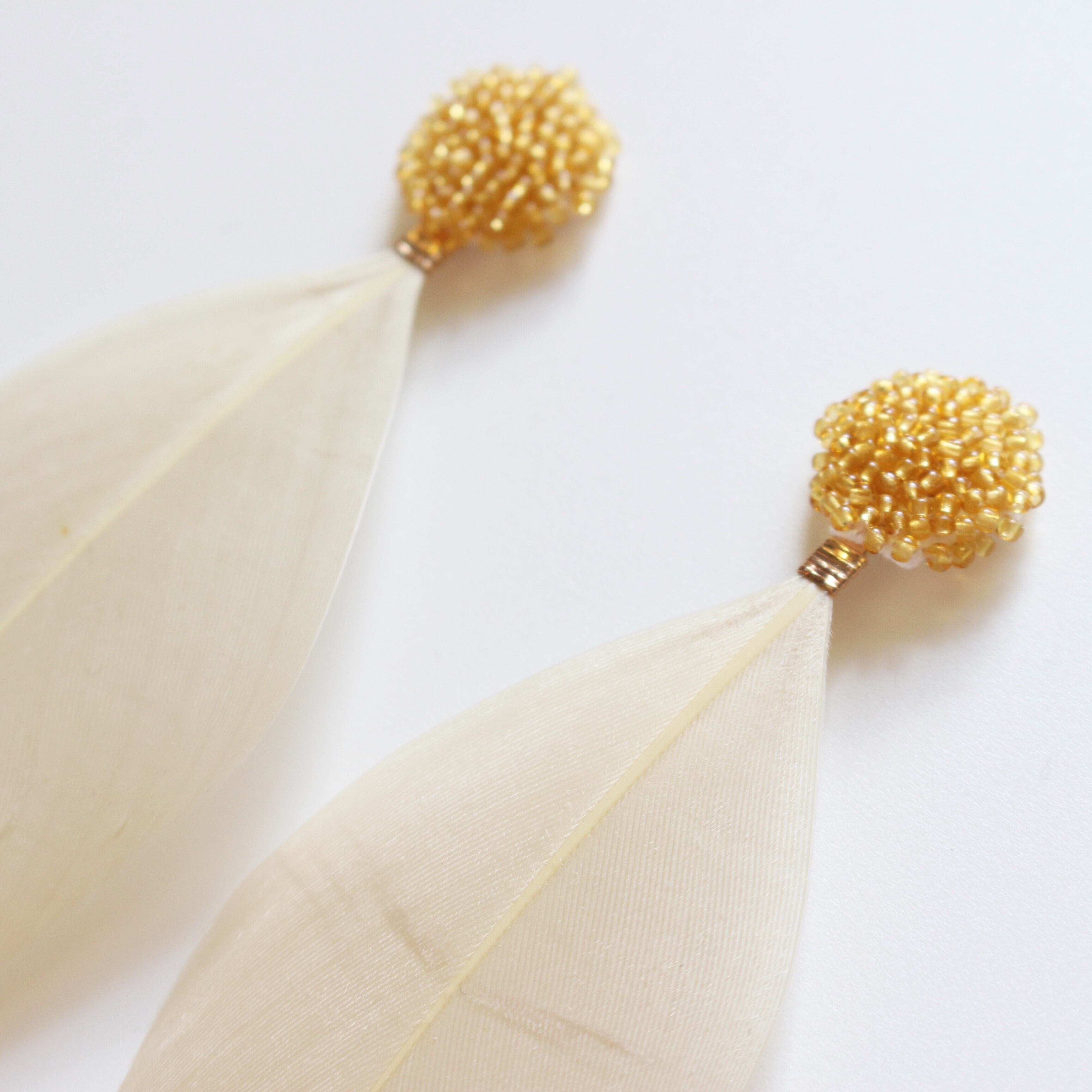 琥珀のように輝くビーズとクリーム色の大きな羽根が