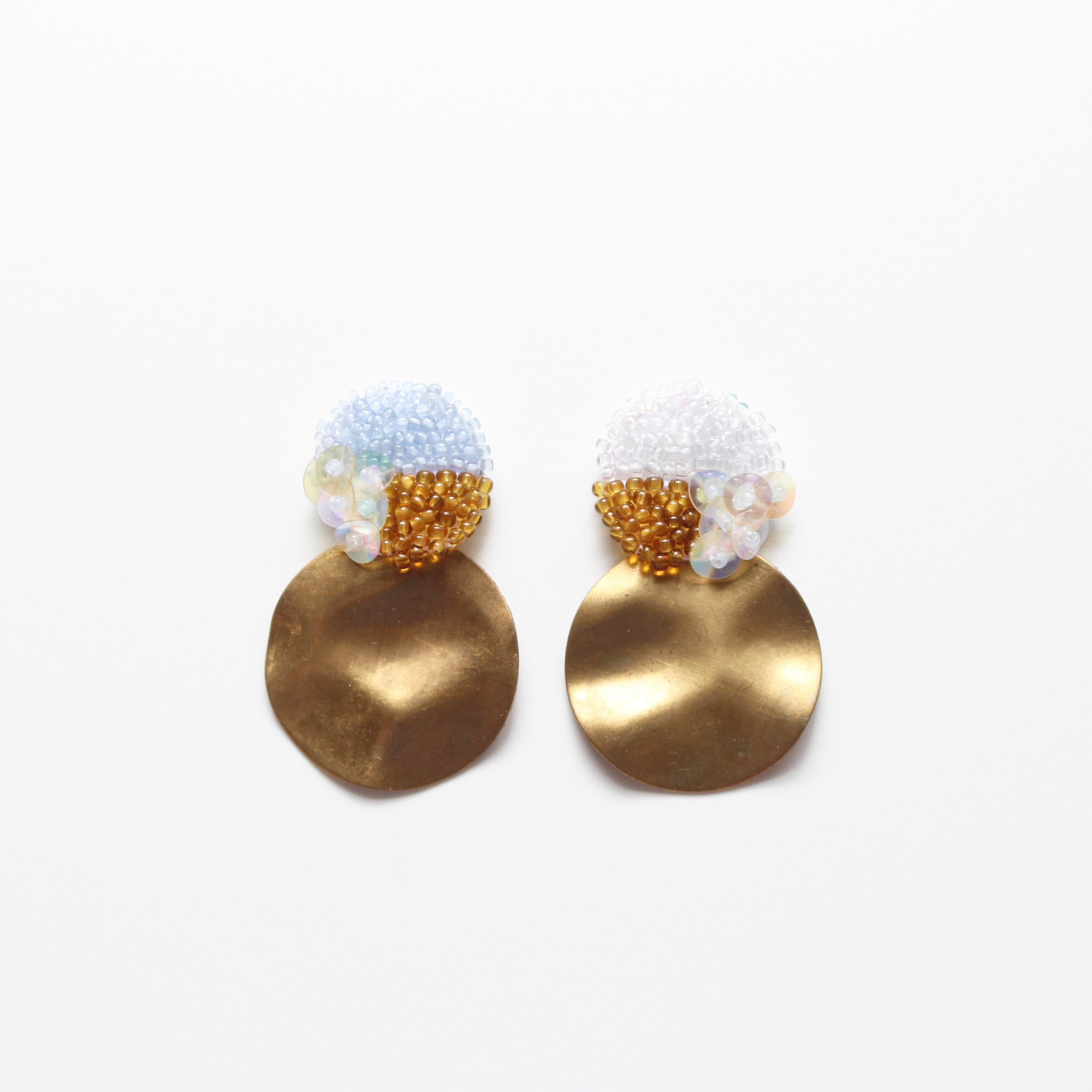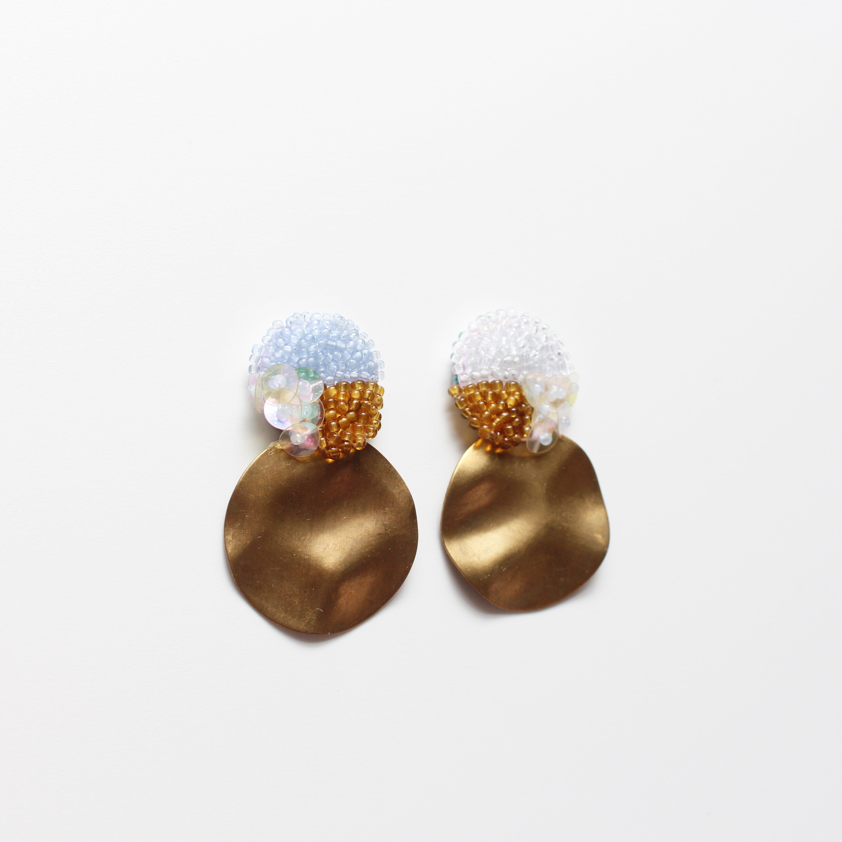 左右配色違いのビーズと、大きな波打つブラスチャームが特徴的なデザイン。
